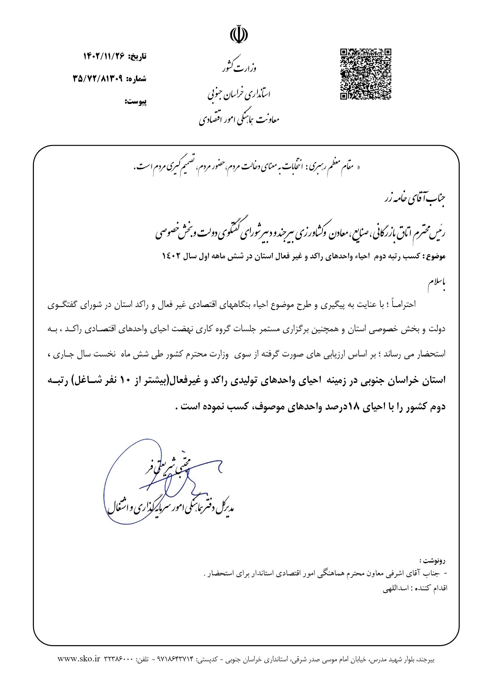 | ۱۵ | کسب رتبه دوم احیاء واحدهای راکد و غیر فعال در شش ماهه نخست سال ۱۴۰۲ | ۱۴۰۲ | لینک | |