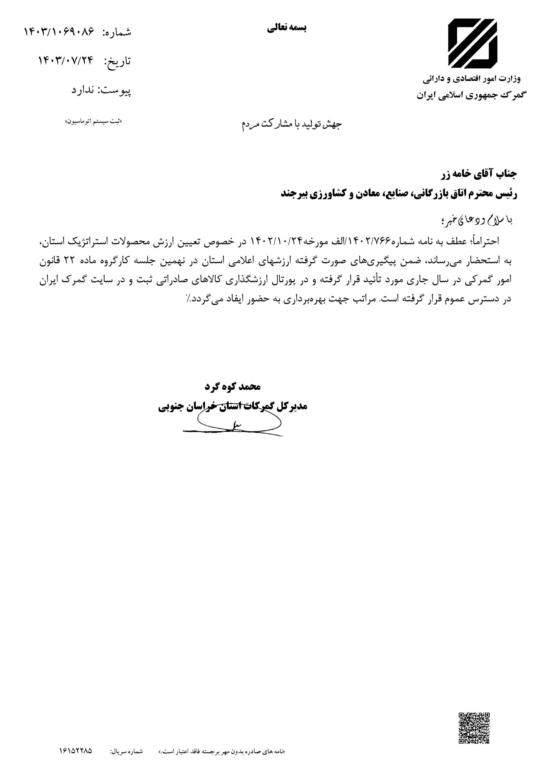 | ۶ | واردات ماشین آلات معدنی از افغانستان و صدور مجوز ایجاد گمرک تخصصی واردات ماشین آلات معدنی و راهسازی در گمرک رسمی ماهیرود | ۱۴۰۱ | ||