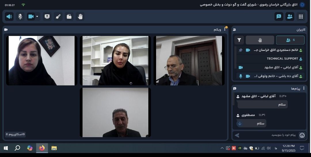 در نشست مسئولان دبیرخانه های شوراهای گفت و گوی منطقه شرق و شمال شرق کشور که در تاریخ ۲۴ شهرماه ۱۴۰۴ به صورت آنلاین برگزار گردید، درخصوص موانع و مشکلات اولویت دار منطقه شرق، پیگیری نظامنامه ی منطقه ای شوراهای گفتگو، لزوم تعامل و هم افزایی منطقه شرق کشور بحث و تبادل نظر گردید.