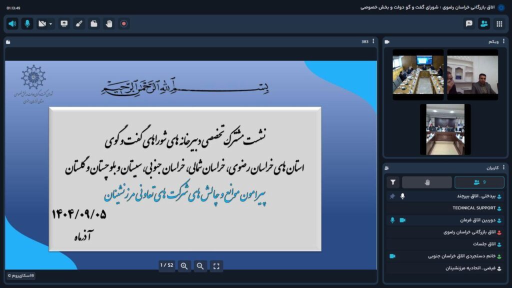 در نشست مشترک دبیرخانه‌های شوراهای گفت‌وگوی استان‌های شرق و شمال شرق کشور که بصورت آنلاین برگزار گردید بسته موانع و چالش های شرکت های تعاونی مرزنشینان و پیشنهادات دبیرخانه های شورای های گفت و گو مورد بحث و بررسی قرار گرفت.